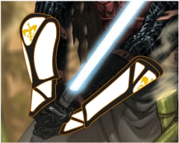 CITAZIONE Equipaggiata: Si (Alla cintura visibile sulla sinistra) Spada laser: Lunga poco più di 30cm, colore nero e un particolare rosso nella zona del cristallo, sull'elsa vi sono varie incisioni come graffi di artigli, cristallo leggermente visibile. Colore della lama Arancio/Ambrata.  CITAZIONE Modifiche: - Attivazione a riconoscimento: il manico possiede dei sensori che rinoscono il proprietario. Quando è impugnata da un'altra persona, la spada non può essere attivata. - Impugnatura a pressione: questa modifica è molto popolare, e fa in modo che la lama si disattivi quando viene a mancare la presa dell'utilizzatore. la lama può essere ancora lanciata, ma si spegnerà subito dopo aver colpito il bersaglio. - Silenziosa: le lame delle spade laser emettono sempre un caratteristico ronzio. Con questa modifica la lama è opportunamente modificata in modo da risultare perfettamente silenziosa, per non compromettere certe situazioni in cui è essenziale non rivelarsi. Droidi: Navi.